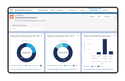Salesforce connects and consolidates all data so you can manage constituents, donations, and programs more effectively—all from a centralized platform. With a real-time, 360-view of your organization, Salesforce gives you actionable, data-driven insights into marketing, fundraising, and program development so you can drive your mission forward.